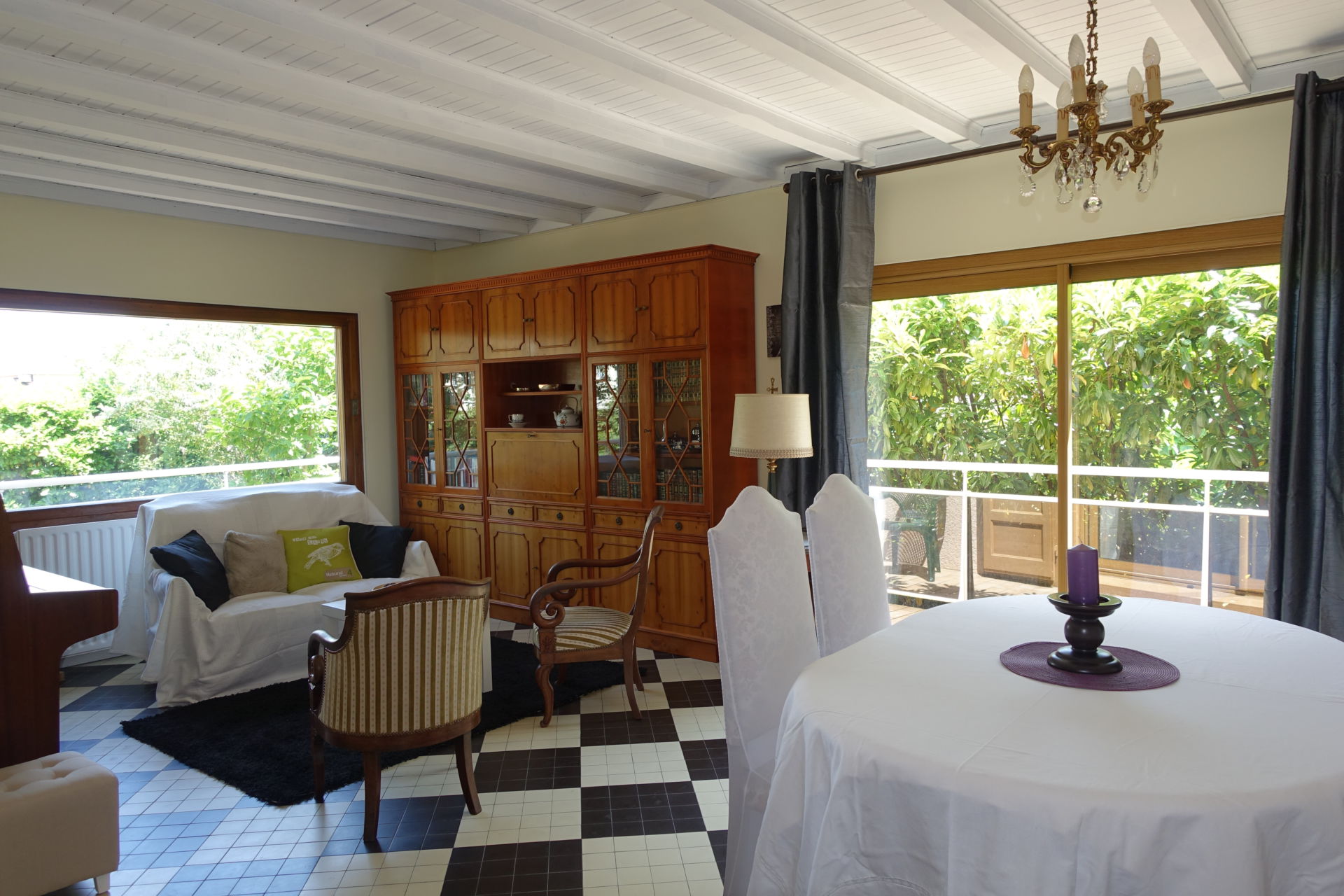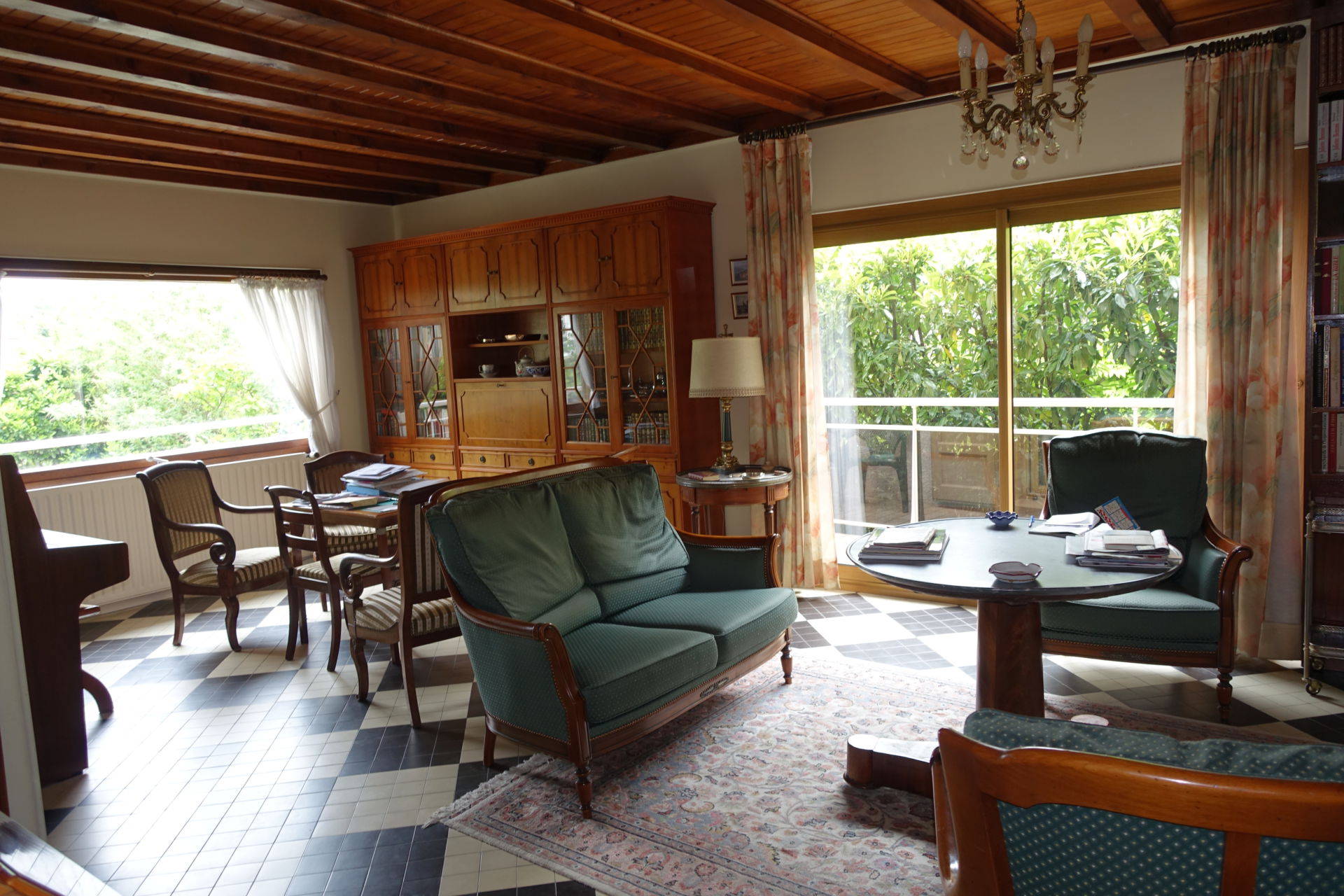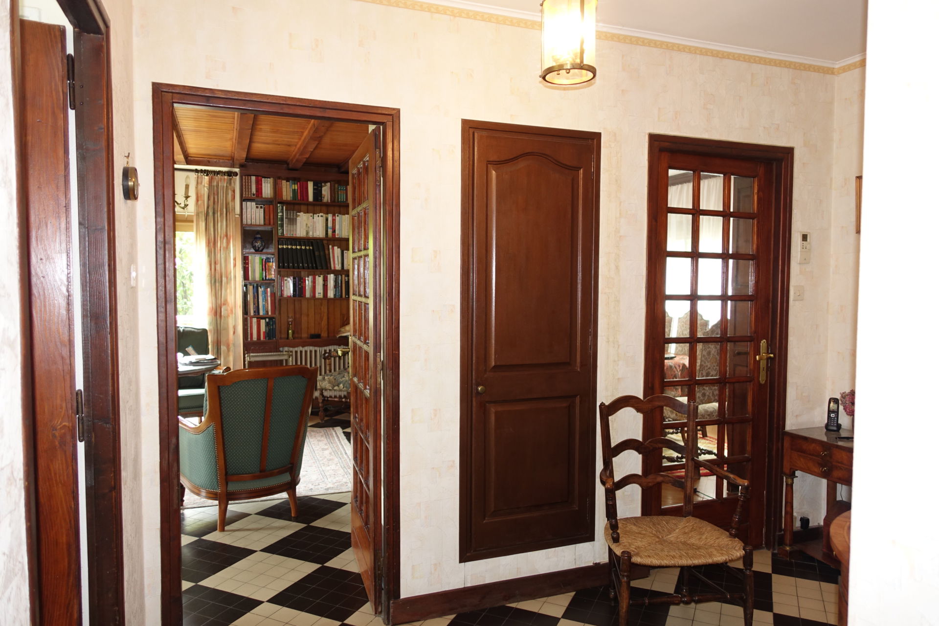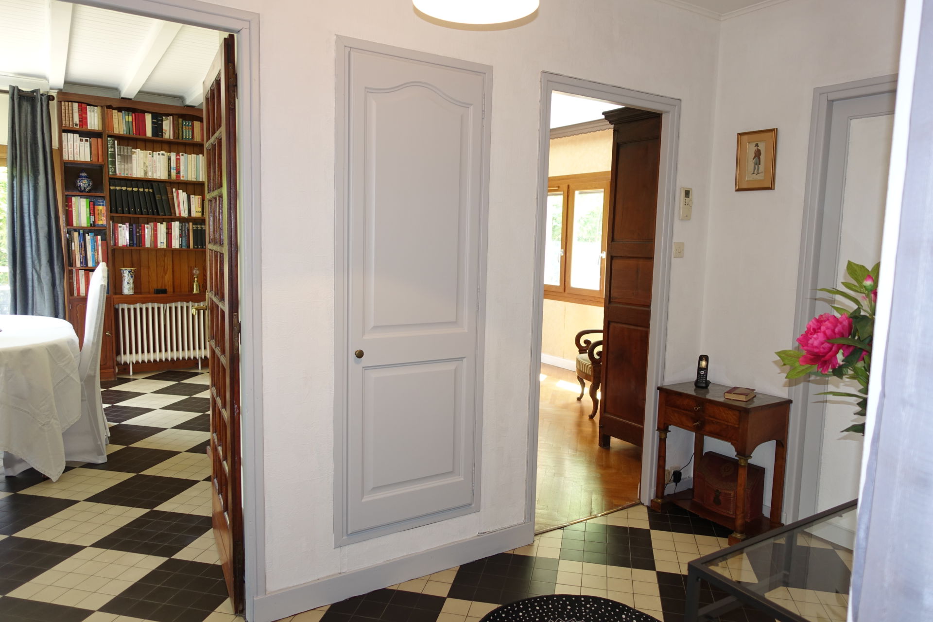 Nous avons peint le plafond en bois verni sombre et assez démodé en blanc ainsi que les boiseries de l'entrée en gris perle. Les pièces ont été désencombrées, harmonisées et chacune a retrouvé une fonction définie.